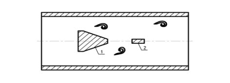 旋渦列在旋渦發(fā)生體下游非對稱地排列。設(shè)旋渦的發(fā)生頻率為f,被測介質(zhì)來流的平均速度為V,