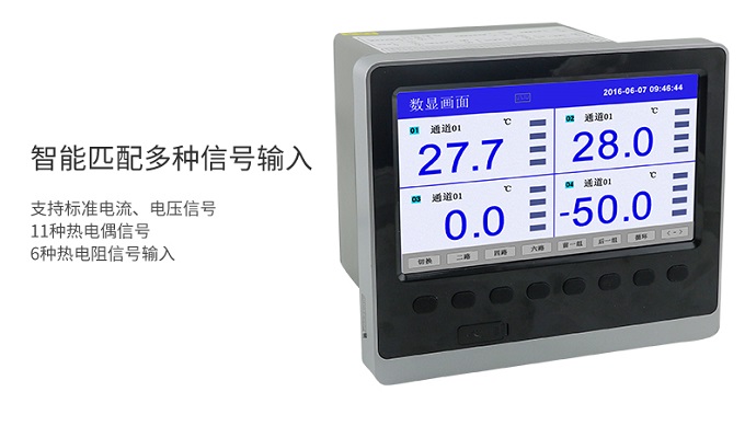 SIN-R6000C系列彩色無紙記錄儀48路(萬能輸入(可組態選擇輸入:標準電壓、標準電流、熱電偶、熱電阻、頻率、毫伏等)??蓭?8路報警輸出,12個變送輸出,RS232/485通訊接口,以太網接口,微型打印機接口和USB接口,SD卡插座;可提供傳感器配電;具有強大的顯示功能,實時曲線顯示,歷史曲線追憶,棒圖顯示,報警列表顯示。人性化的外觀設計、良好的功能體現、可靠的硬件品質、精湛的制造工藝,使SIN-R6000C具有更高的性能價格比。